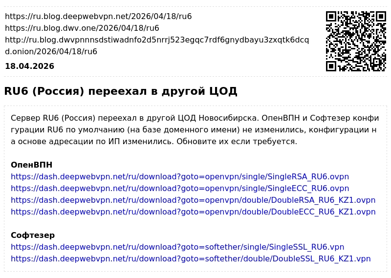 Сервер RU6 (Россия) переехал в другой ЦОД Новосибирска. ОпенВПН и Софтезер конфигурации RU6 по умолчанию (на базе доменного имени) не изменились, конфигурации на основе адресации по ИП изменились. Обновите их если требуется.